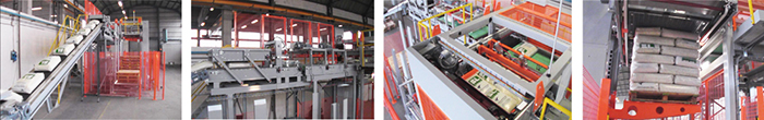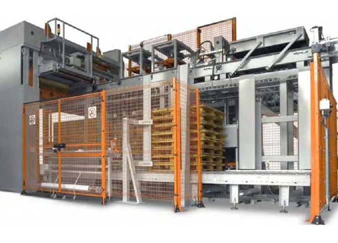 高位碼垛機將料袋輸送至需求高度后,按照預定方式對料袋進行轉位、編組、推袋、分層、碼放,將料袋按層碼放到托盤上,后將碼好的滿垛輸出。