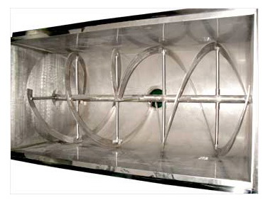 臥式螺帶混合機由傳動部件、雙層螺條攪拌器、U形桶體組成。外螺條盤繞形式配合旋轉方向把物料從兩端向中間推動,而內螺條把物料從中間向兩端推動,螺帶不同的角度、方向繞法使物料產生不同的流動方向,物料通過不斷的對流循環,剪切摻混達到快速混合。