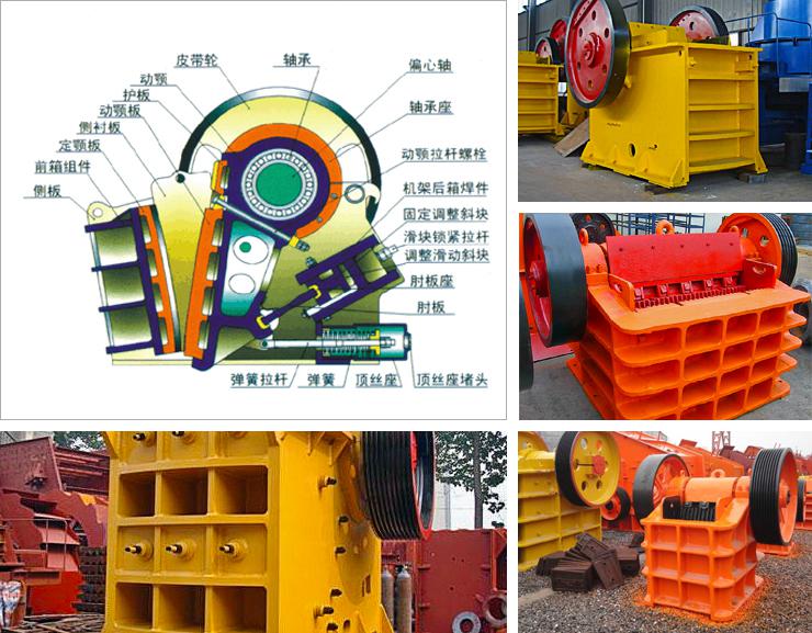 顎破的結構主要有機架、偏心軸、大皮帶輪、飛輪、動顎、側護板、肘板、肘板后座、調隙螺桿、復位彈簧、固定顎板與活動顎板等組成,其中肘板還起到保險作用。